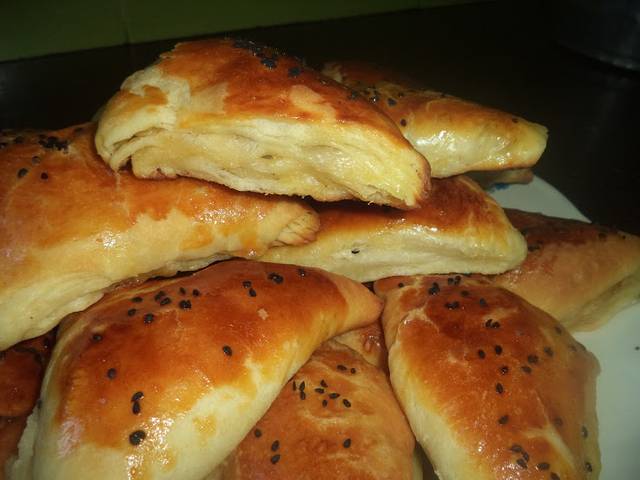 ثم نأخد أول مربع تم تحضيره من العجين و يمدد و يقسم الى مجموعه من المربعات يوضع في طرف كل واحد مقدار من الحشوة و تدهن الاطراف بصفار البيض و تغلق
